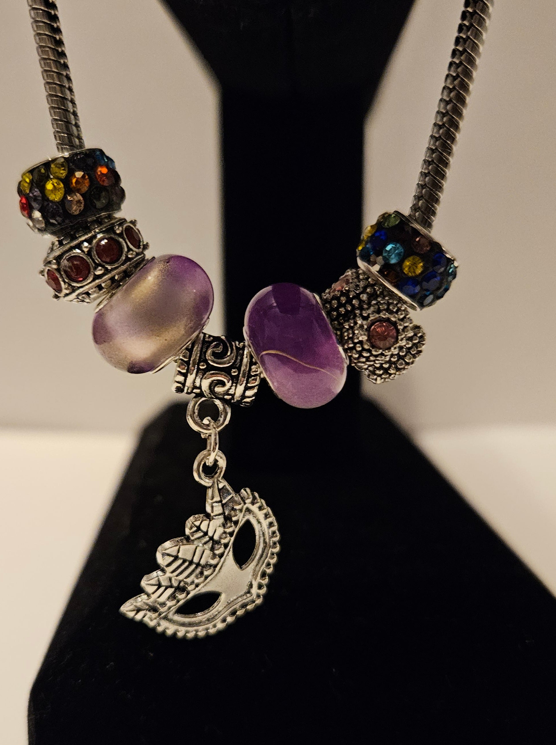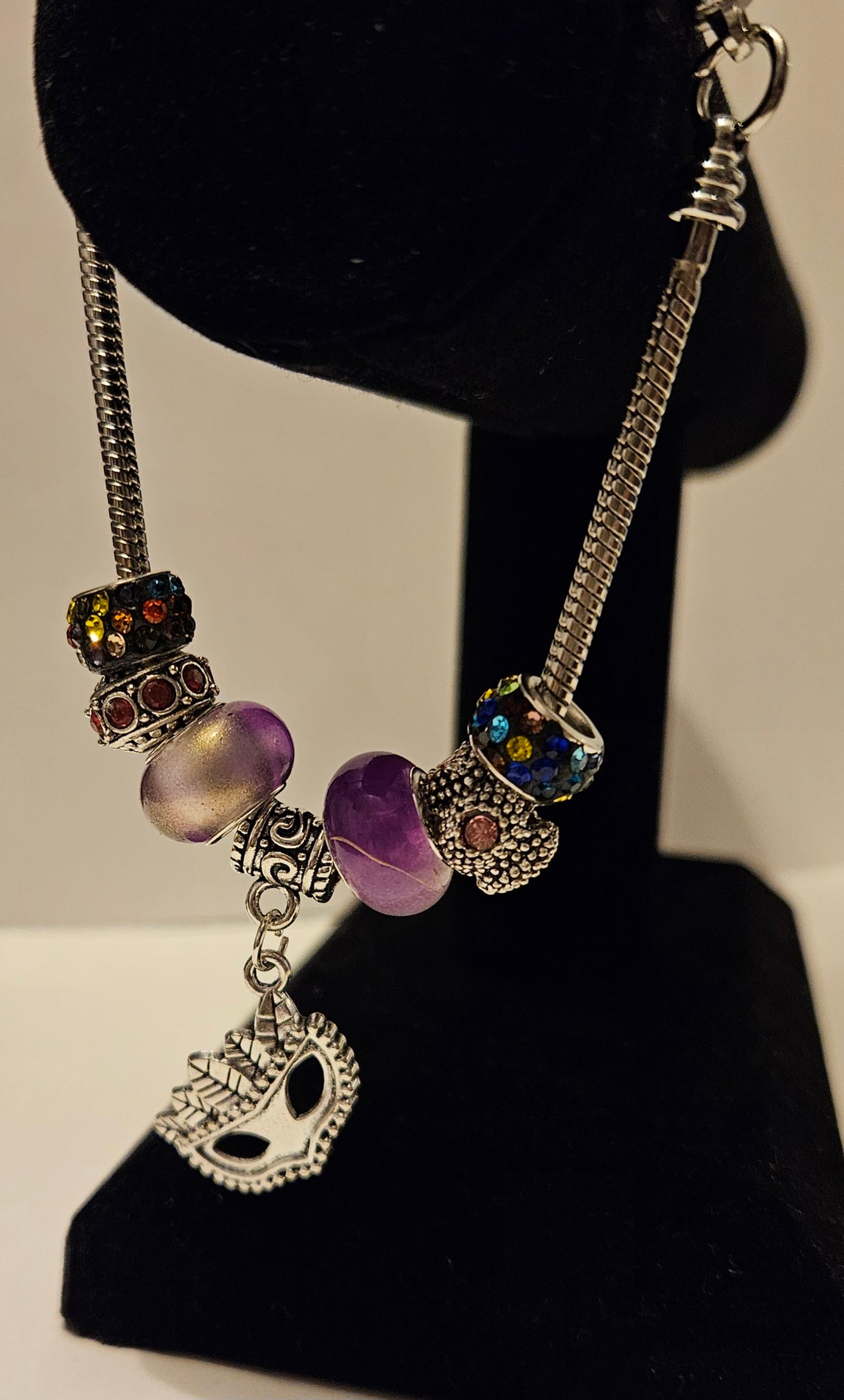 Silver snake bracelet with a Masquerade dangle charm, and purple beaded charms with multi color beads.